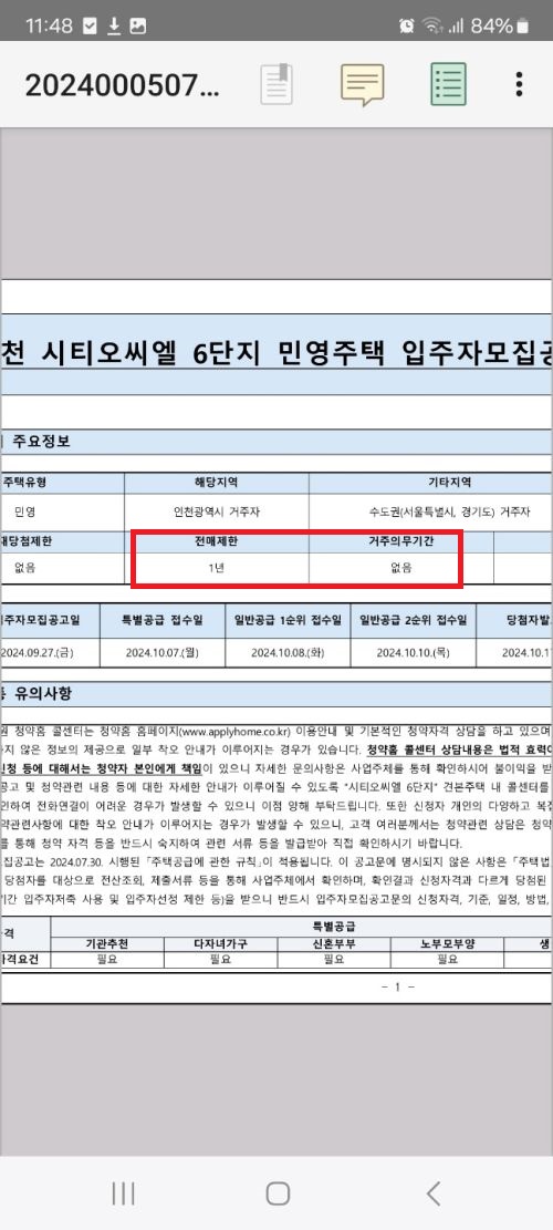 모집공고문보기 다운로드 → 전매제한 및 거주의무기간 확인